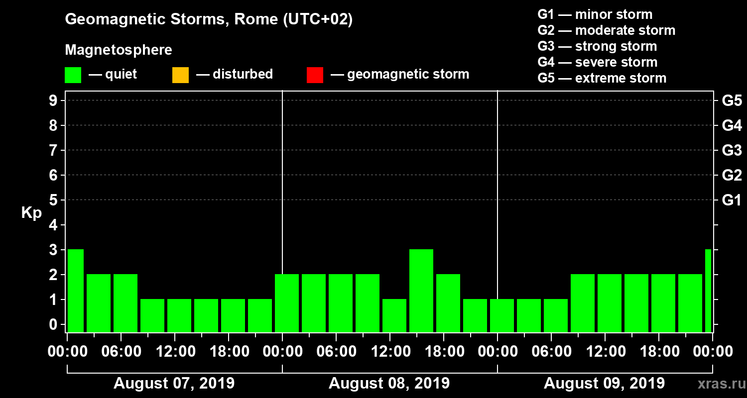 Changes in the geomagnetic index Kp from August 7 to 9, 2019 for mid latitudes