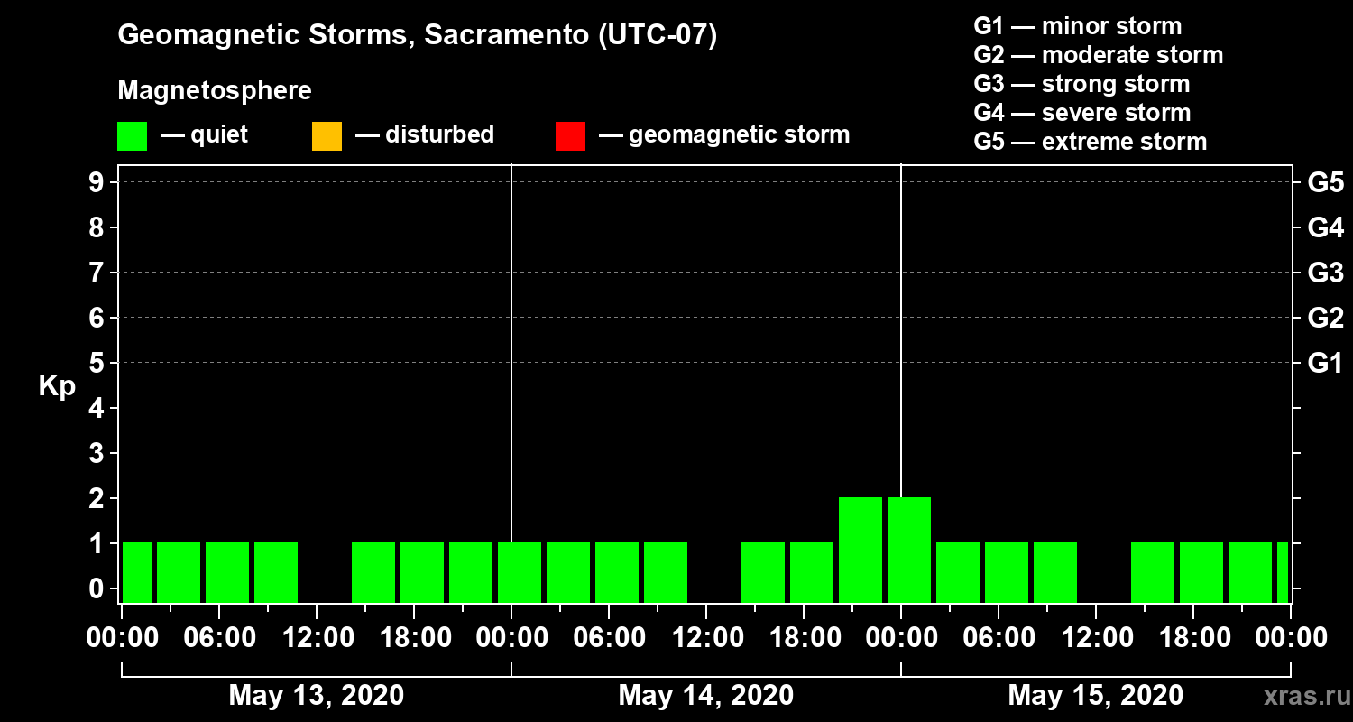 Changes in the geomagnetic index Kp from May 13 to 15, 2020 for mid latitudes