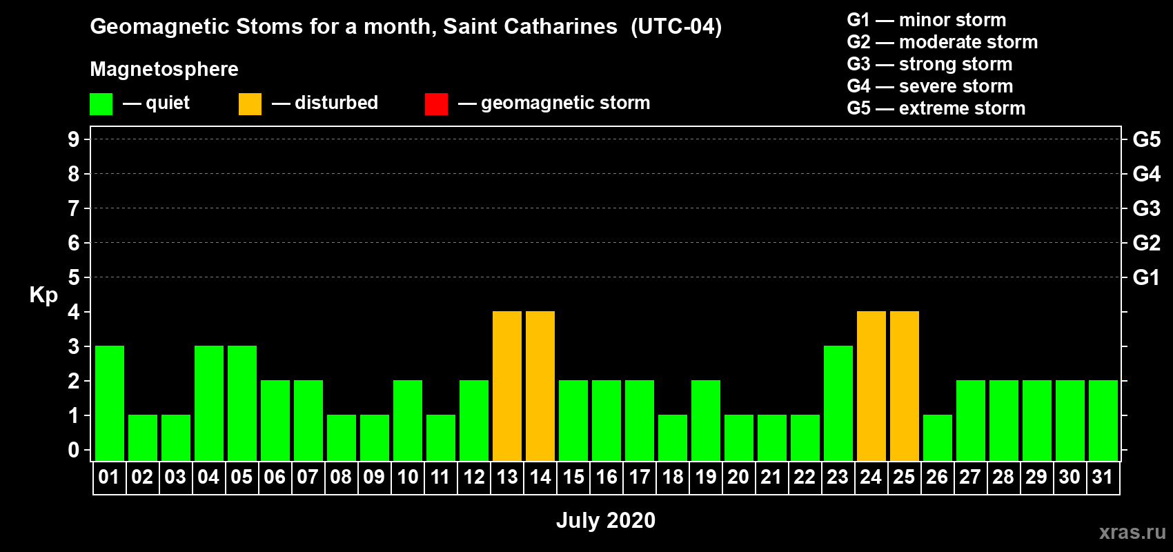Geomagnetic storms in Saint Catharines in July 2020