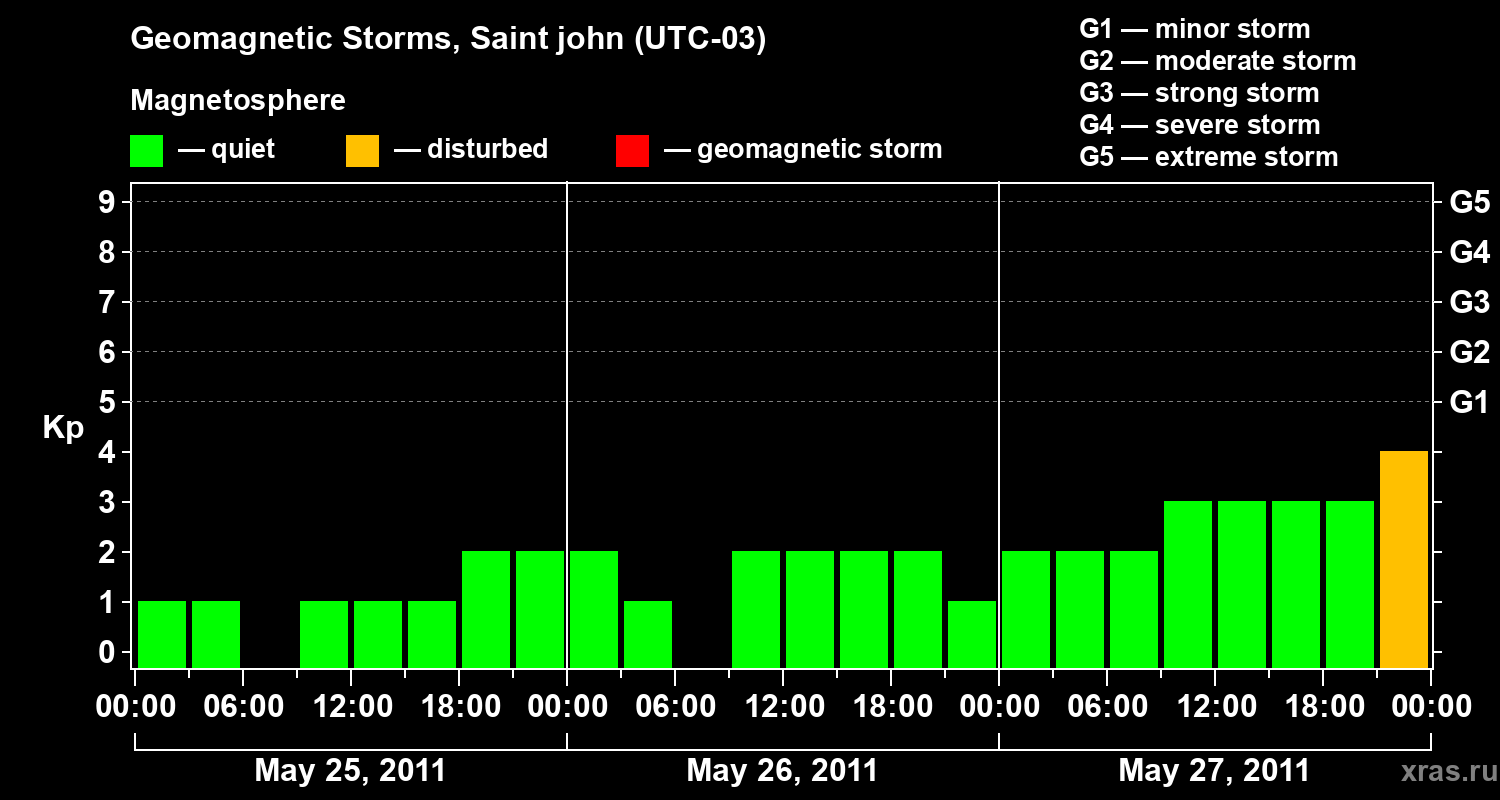 Changes in the geomagnetic index Kp from May 25 to 27, 2011 for mid latitudes