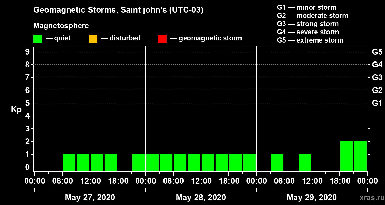 Changes in the geomagnetic index Kp from May 27 to 29, 2020 for mid latitudes
