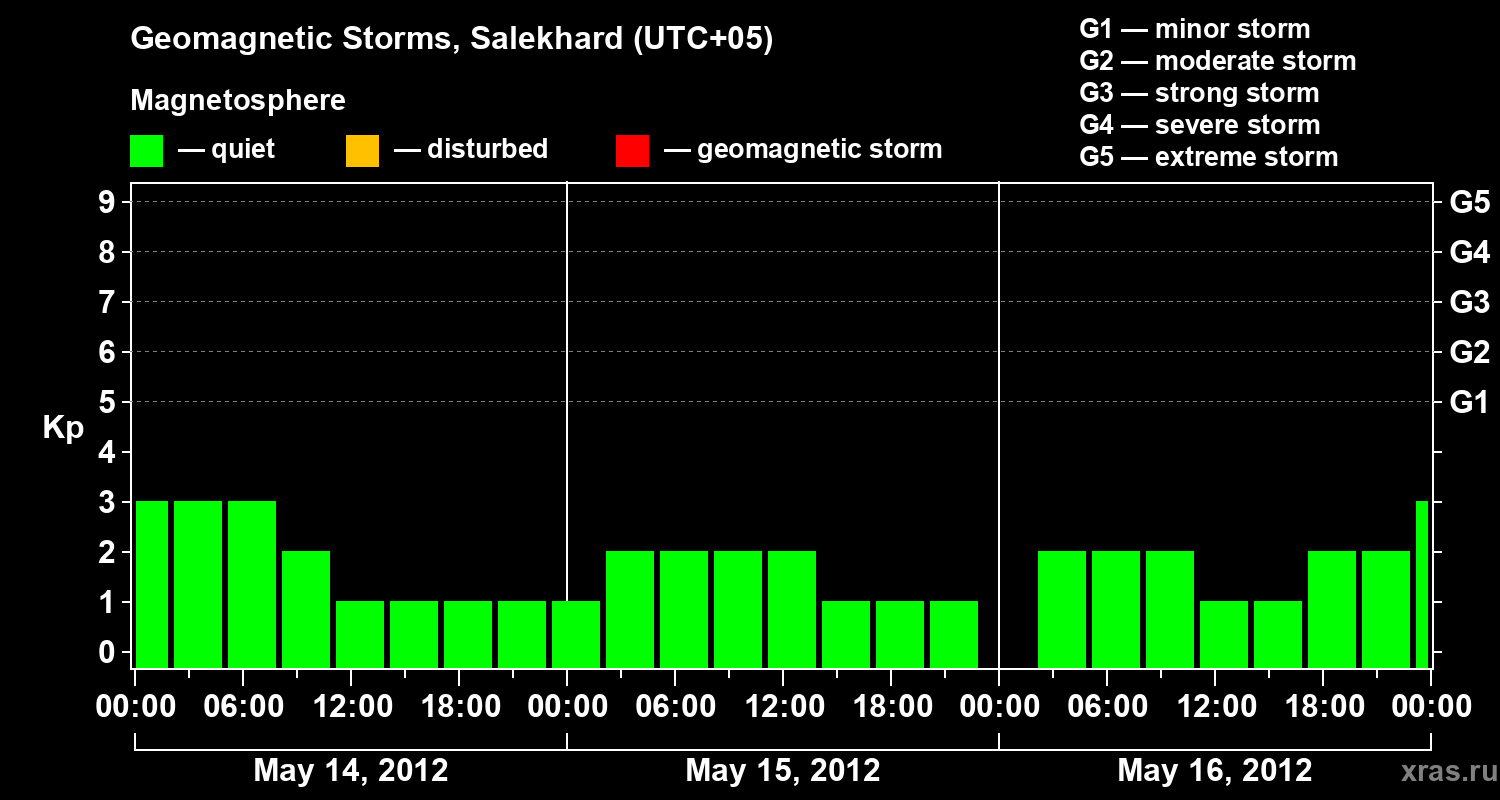 Changes in the geomagnetic index Kp from May 14 to 16, 2012 for mid latitudes