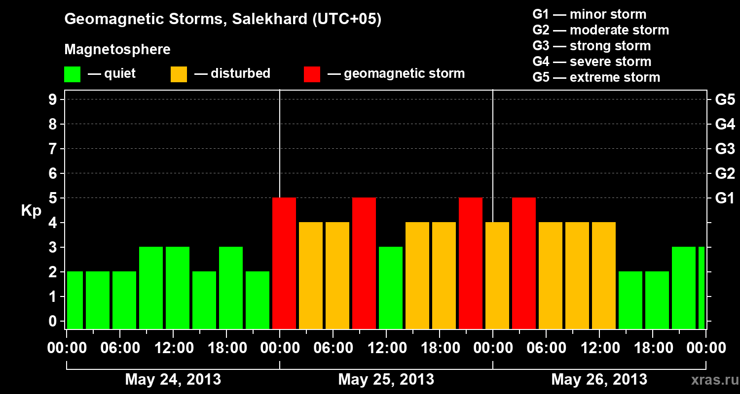 Changes in the geomagnetic index Kp from May 24 to 26, 2013 for mid latitudes