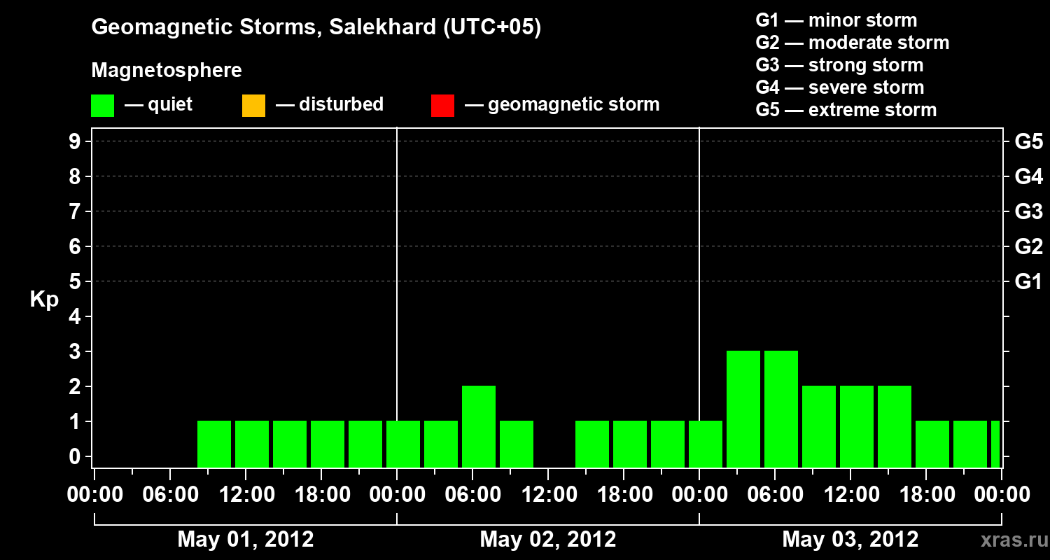 Changes in the geomagnetic index Kp from May 1 to 3, 2012 for mid latitudes