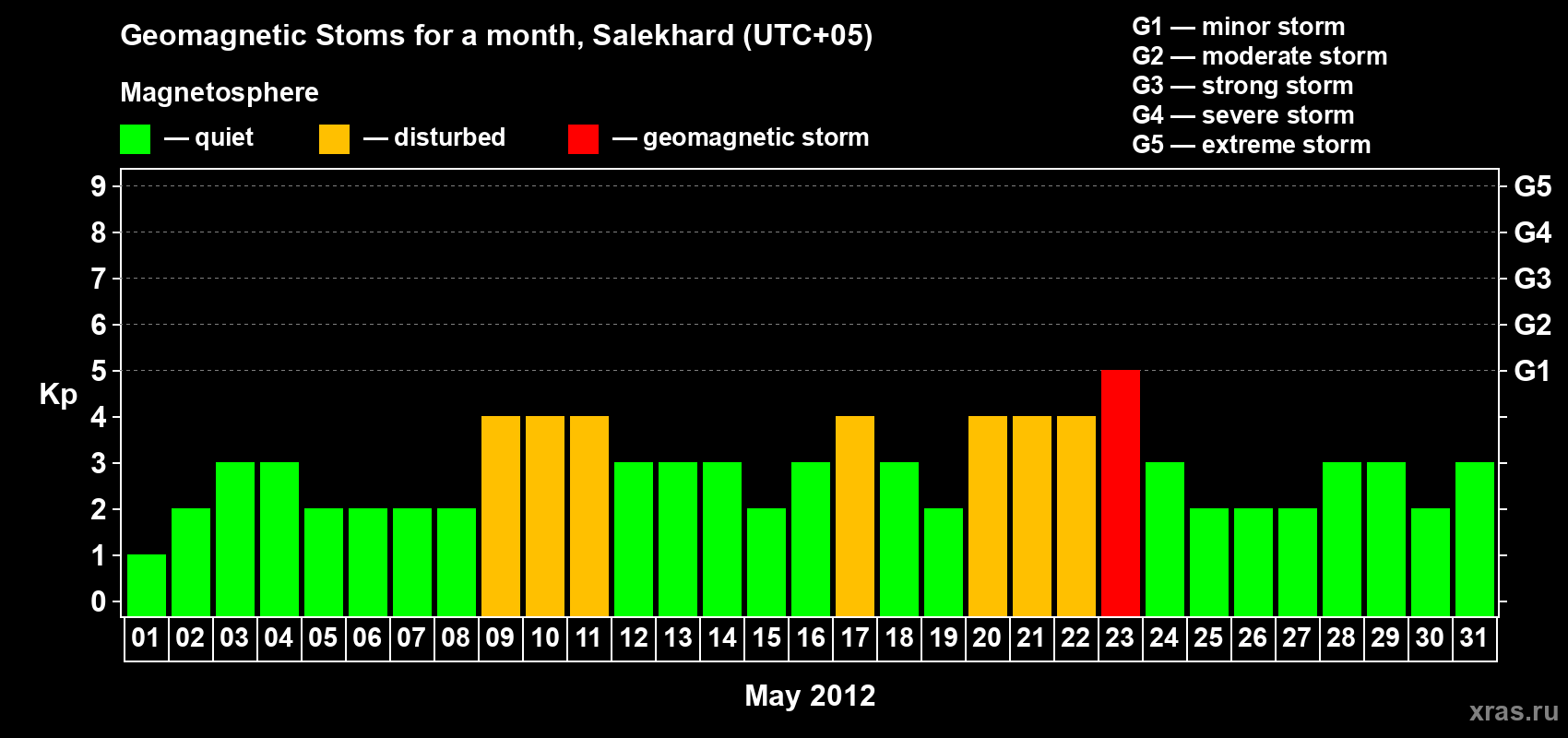 Changes in the maximum daily geomagnetic index Kp in May 2012 for mid latitudes