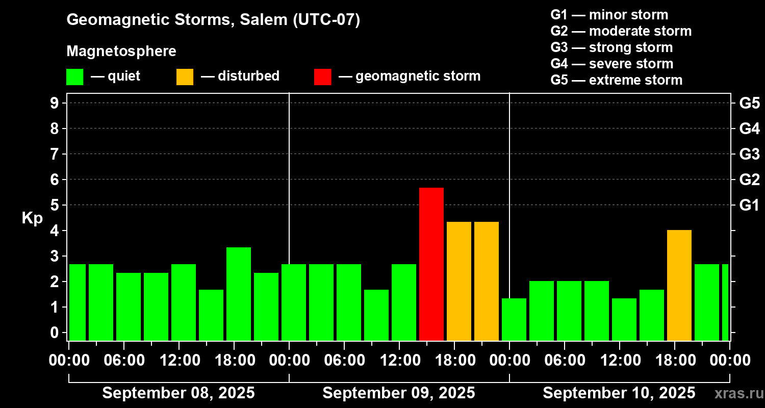 Changes in the geomagnetic index Kp from September 8 to 10, 2025 for mid latitudes