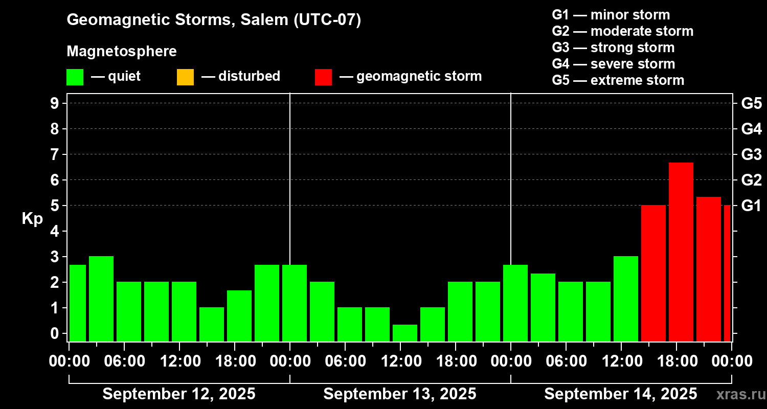 Changes in the geomagnetic index Kp from September 12 to 14, 2025 for mid latitudes
