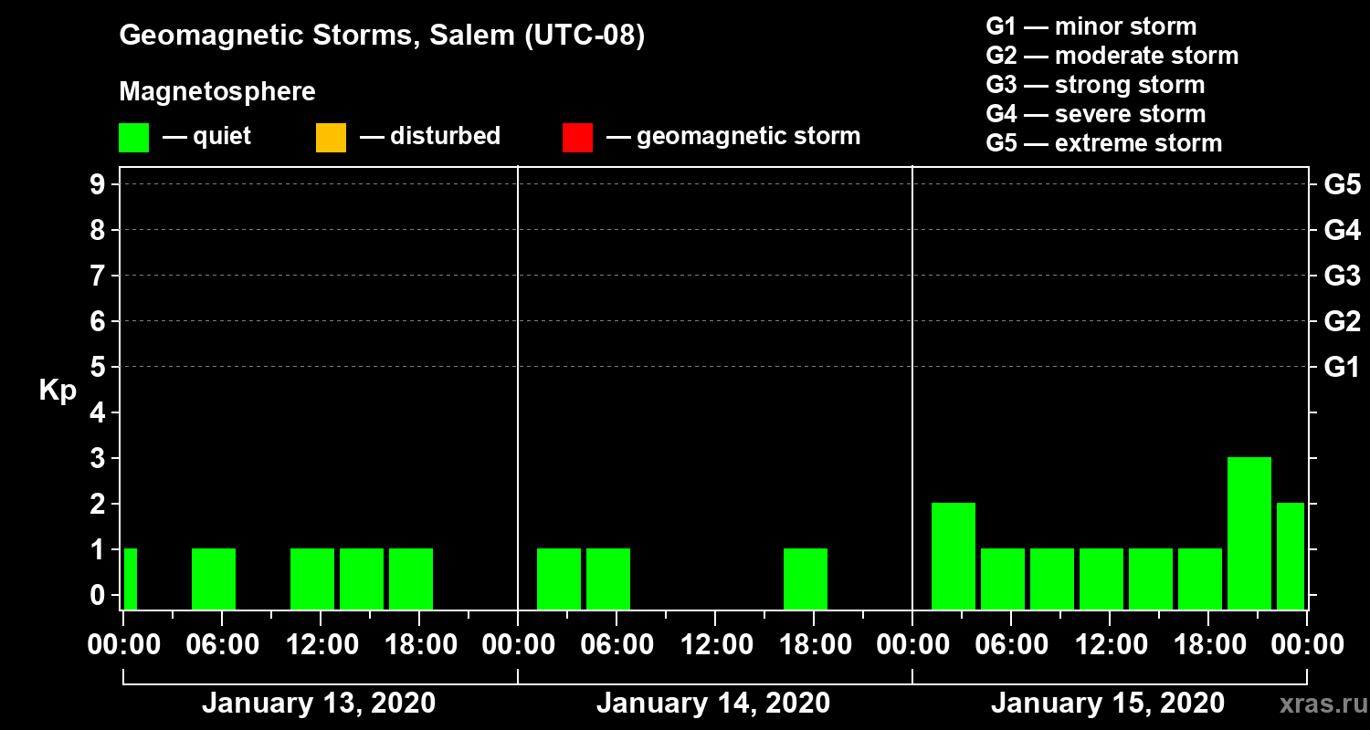 Changes in the geomagnetic index Kp from January 13 to 15, 2020 for mid latitudes