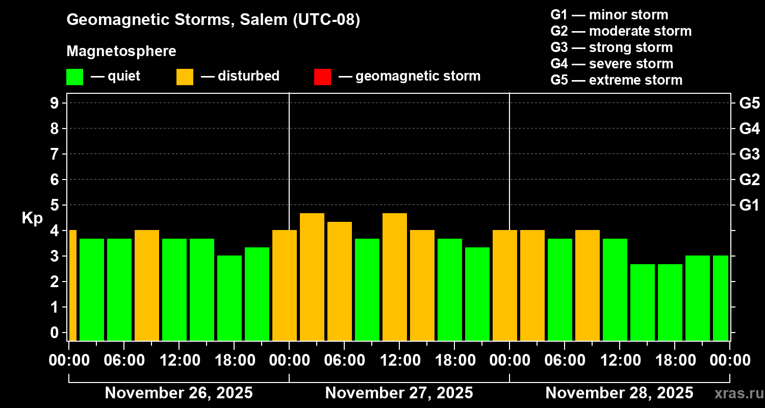 Changes in the geomagnetic index Kp from November 26 to 28, 2025 for mid latitudes
