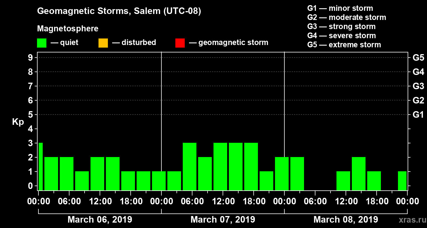 Changes in the geomagnetic index Kp from March 6 to 8, 2019 for mid latitudes