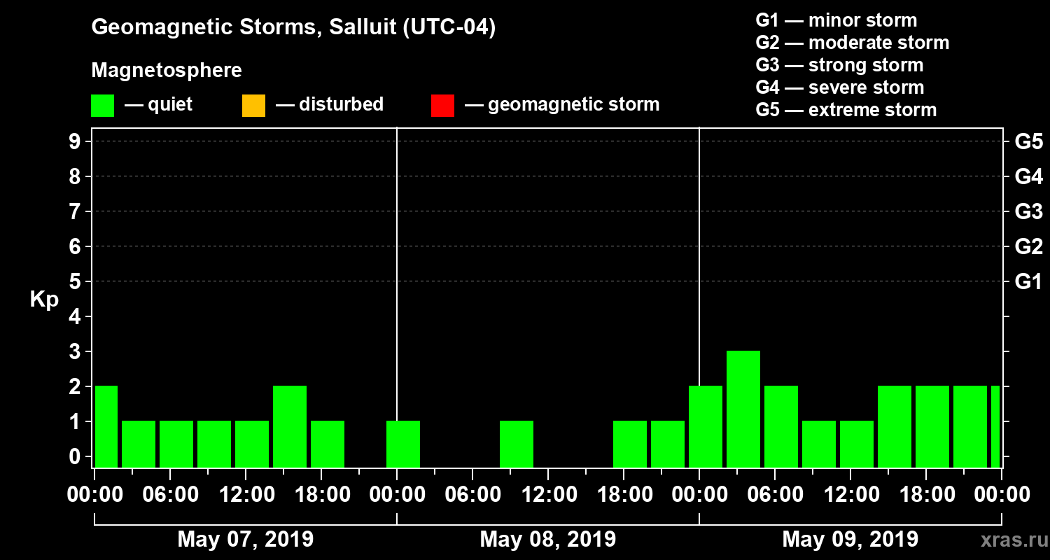 Changes in the geomagnetic index Kp from May 7 to 9, 2019 for mid latitudes
