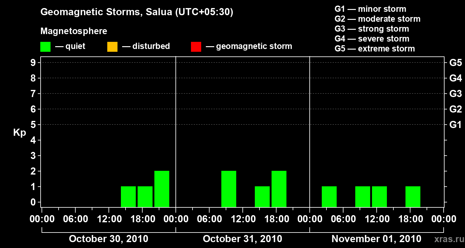 Changes in the geomagnetic index Kp from October 30 to November 1, 2010 for mid latitudes