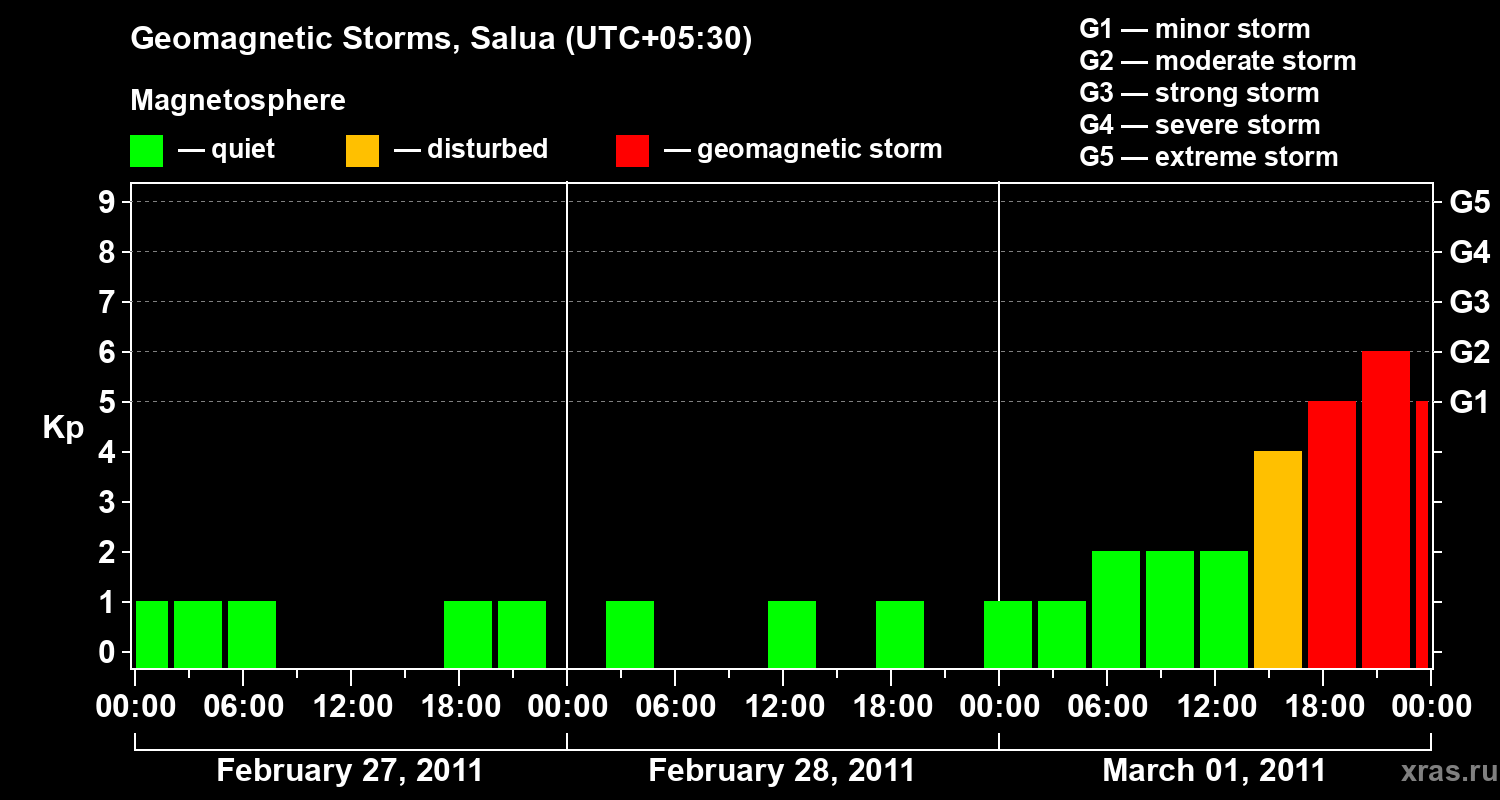 Changes in the geomagnetic index Kp from February 27 to March 1, 2011 for mid latitudes