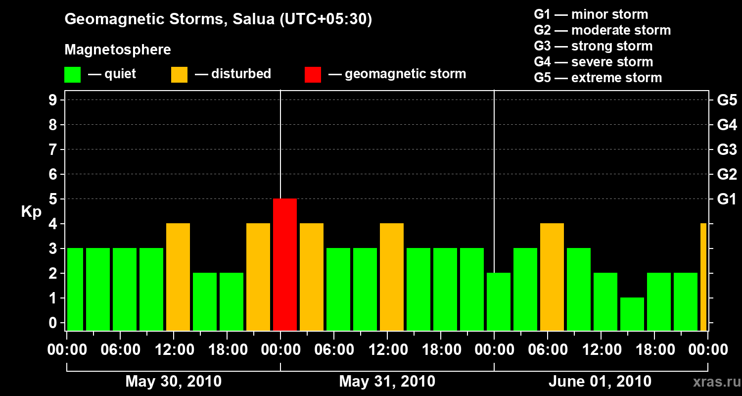 Changes in the geomagnetic index Kp from May 30 to June 1, 2010 for mid latitudes