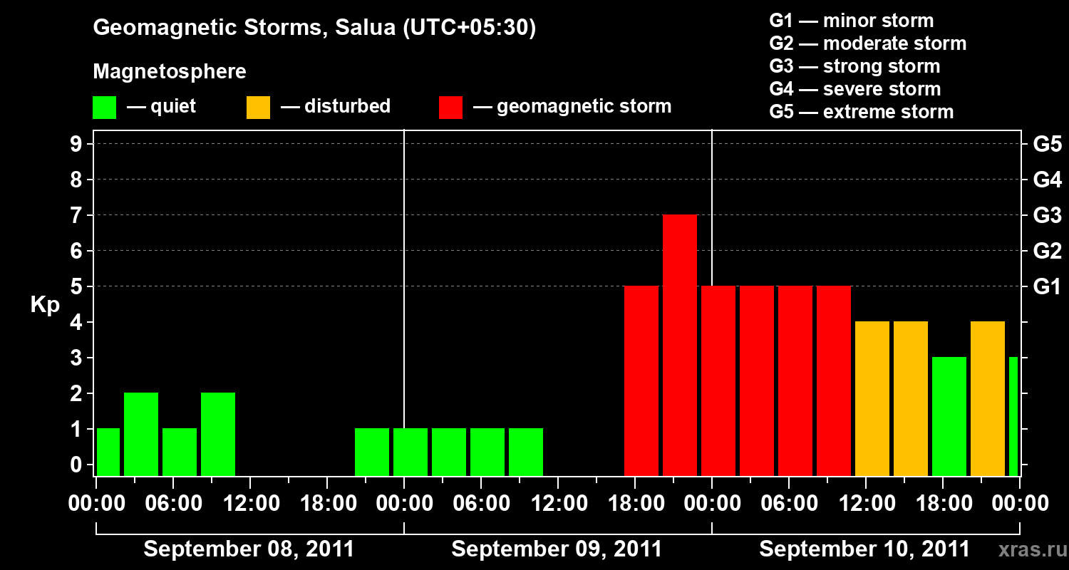 Changes in the geomagnetic index Kp from September 8 to 10, 2011 for mid latitudes
