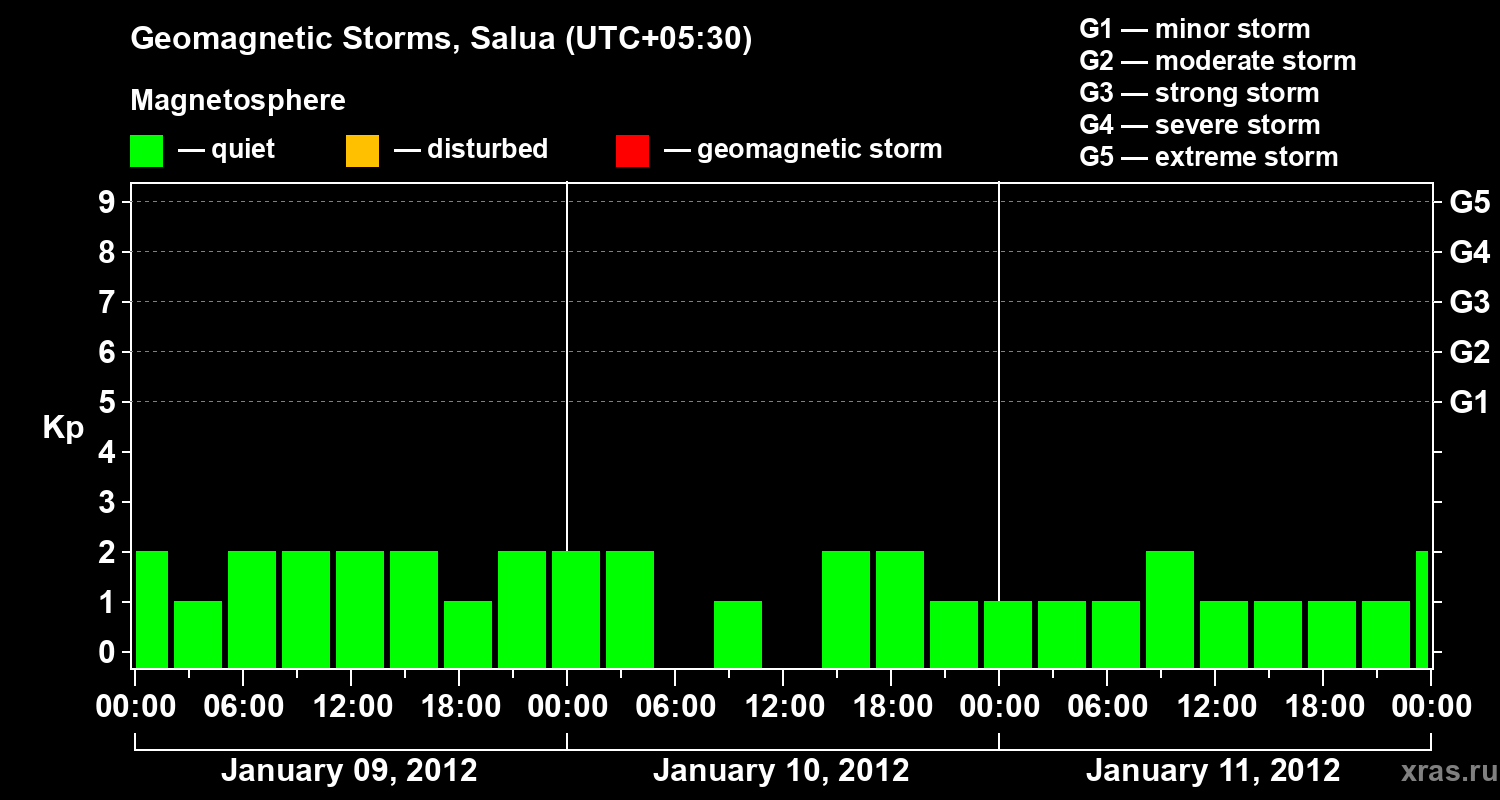 Changes in the geomagnetic index Kp from January 9 to 11, 2012 for mid latitudes