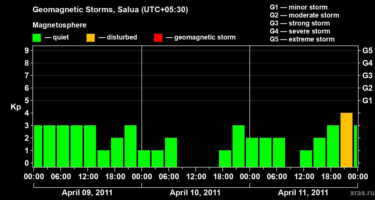 Changes in the geomagnetic index Kp from April 9 to 11, 2011 for mid latitudes