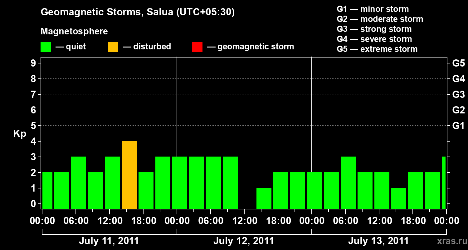Changes in the geomagnetic index Kp from July 11 to 13, 2011 for mid latitudes