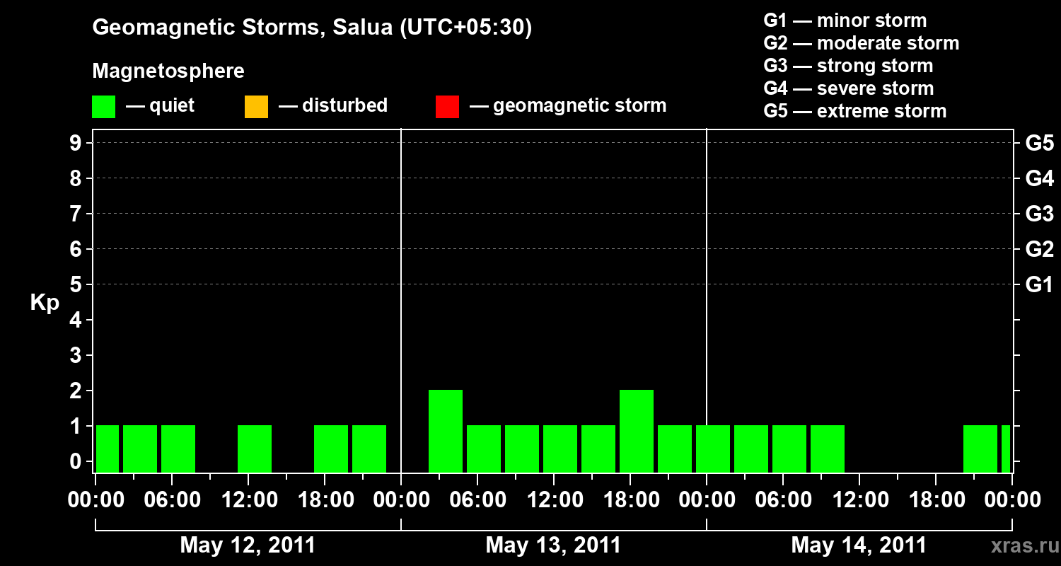 Changes in the geomagnetic index Kp from May 12 to 14, 2011 for mid latitudes
