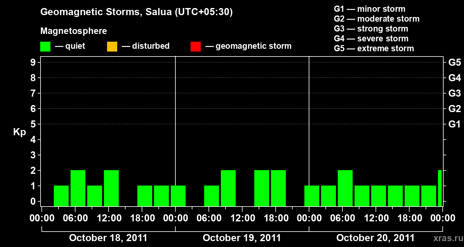 Changes in the geomagnetic index Kp from October 18 to 20, 2011 for mid latitudes