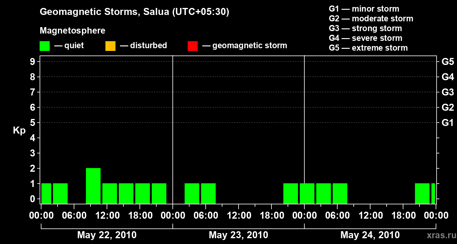 Changes in the geomagnetic index Kp from May 22 to 24, 2010 for mid latitudes