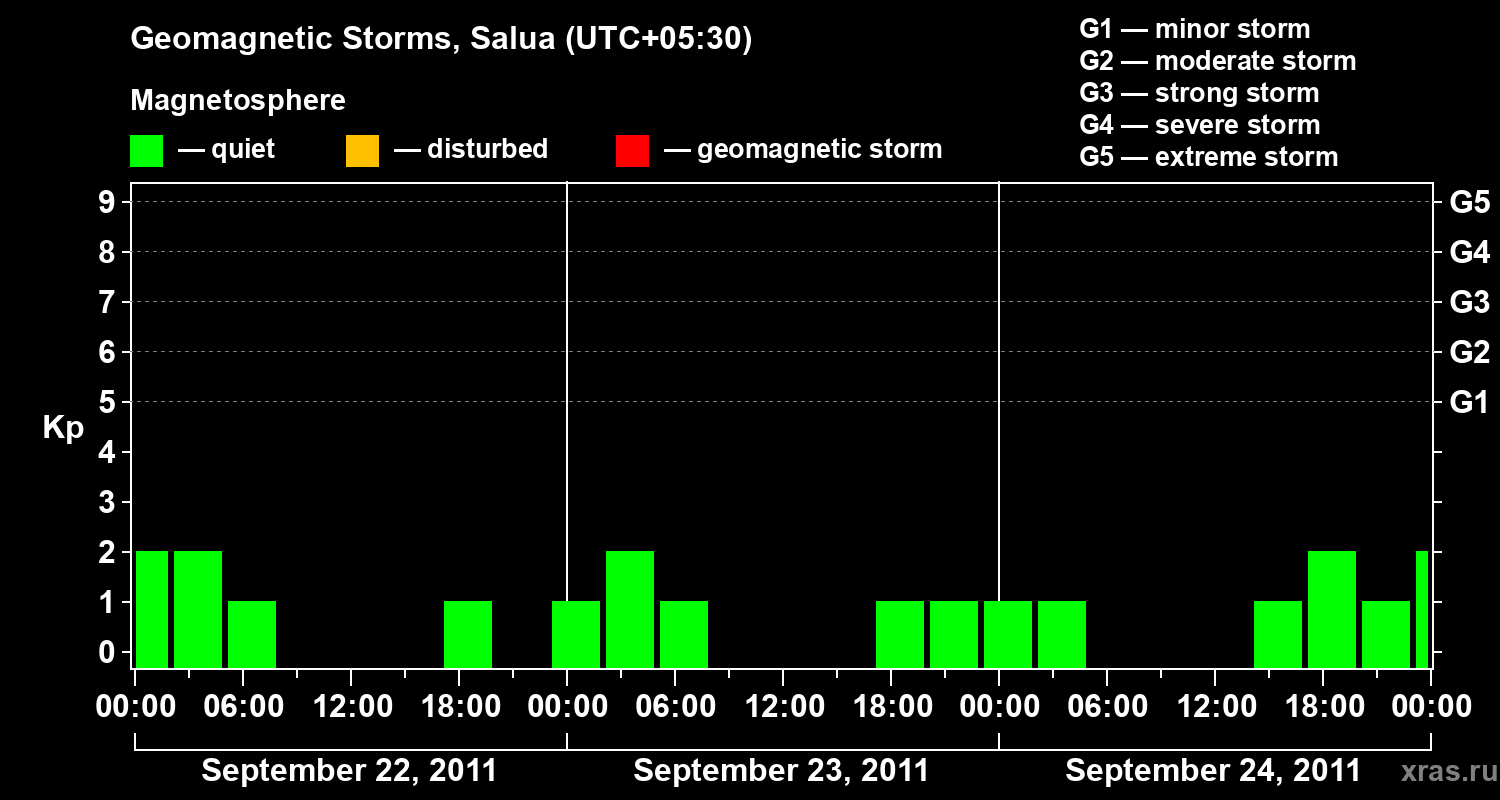 Changes in the geomagnetic index Kp from September 22 to 24, 2011 for mid latitudes