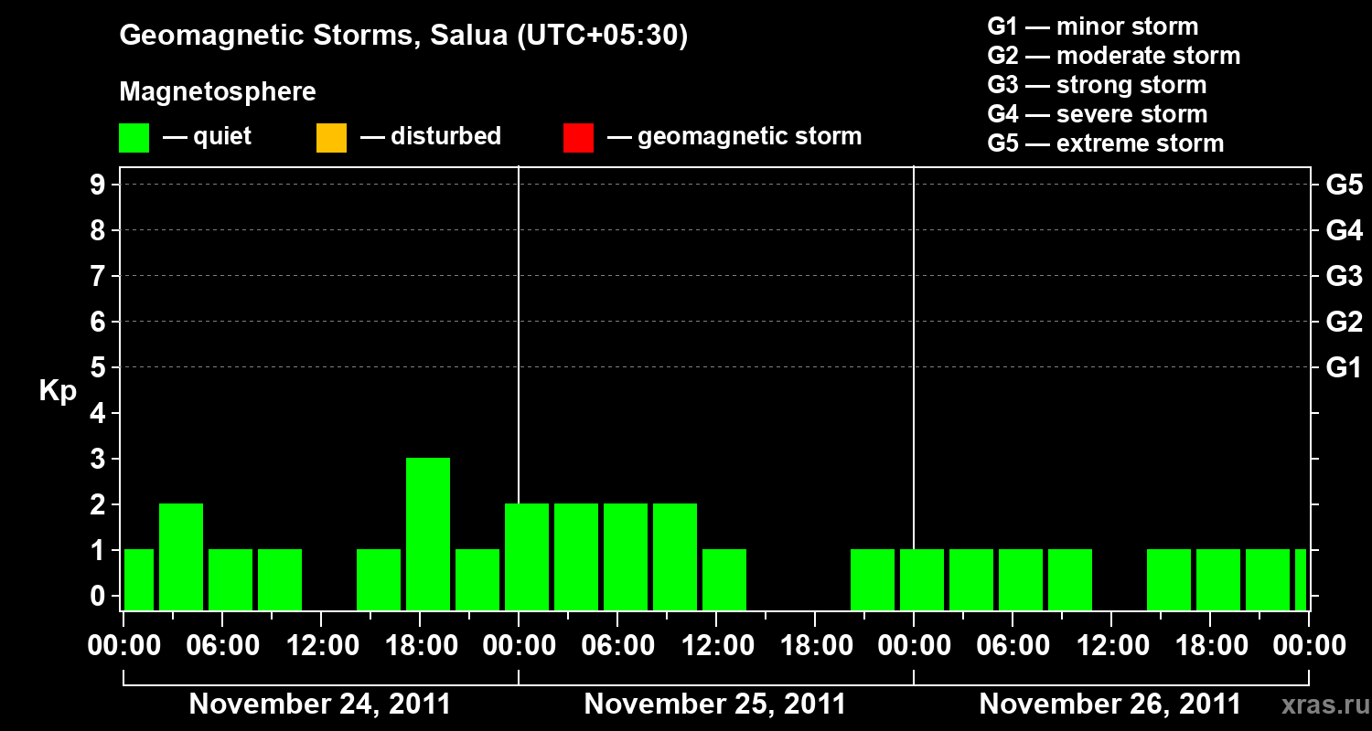 Changes in the geomagnetic index Kp from November 24 to 26, 2011 for mid latitudes