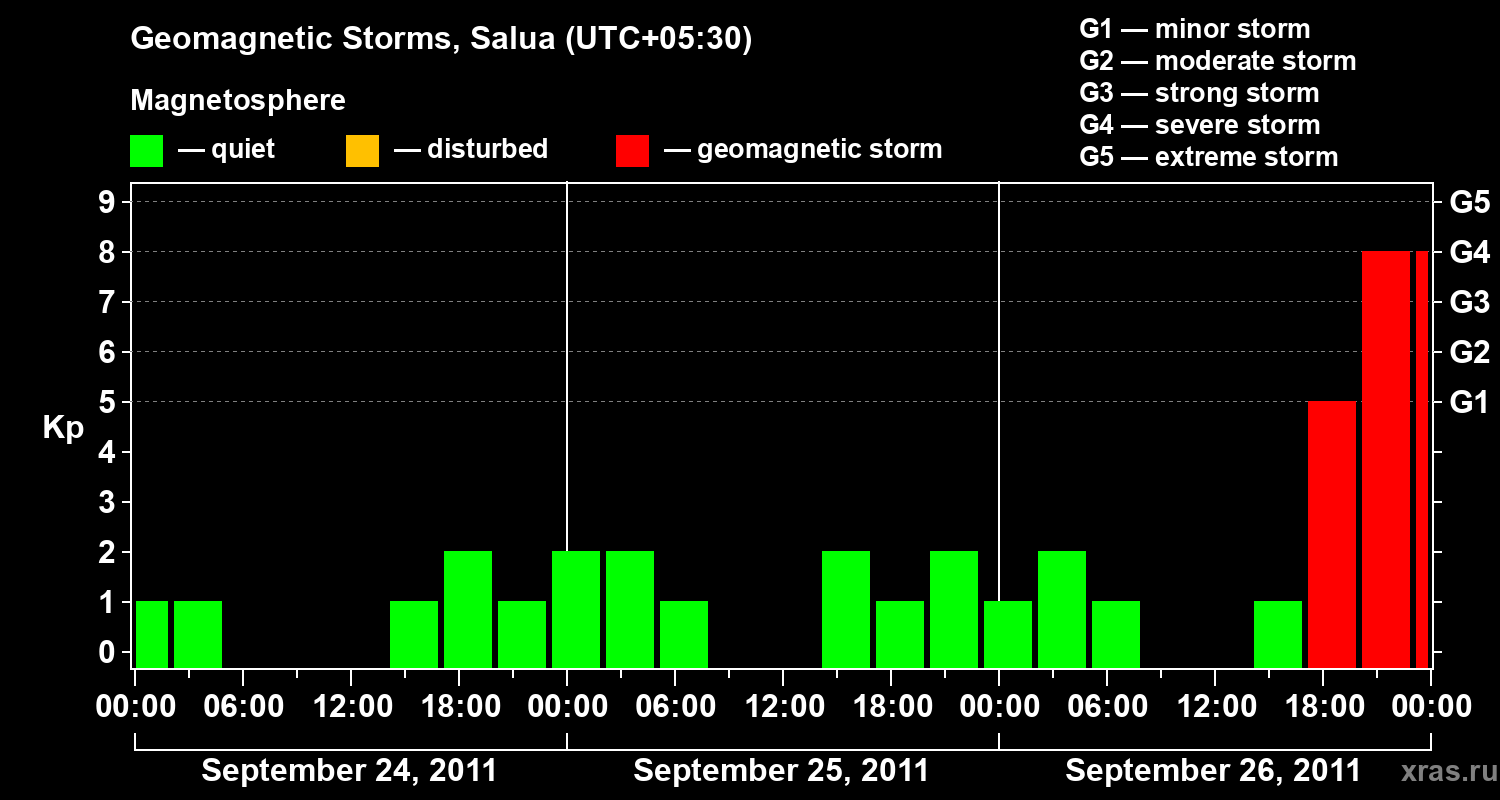 Changes in the geomagnetic index Kp from September 24 to 26, 2011 for mid latitudes
