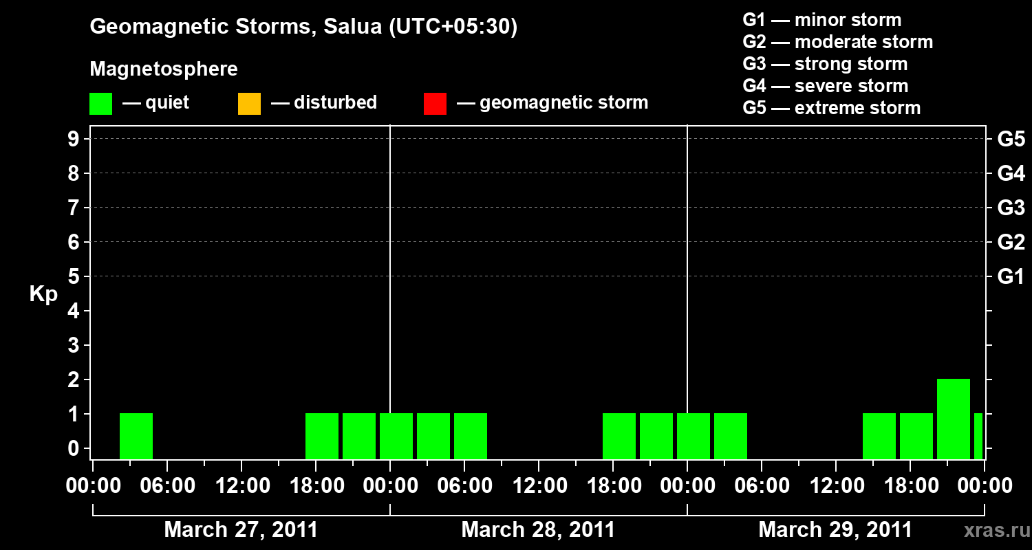 Changes in the geomagnetic index Kp from March 27 to 29, 2011 for mid latitudes