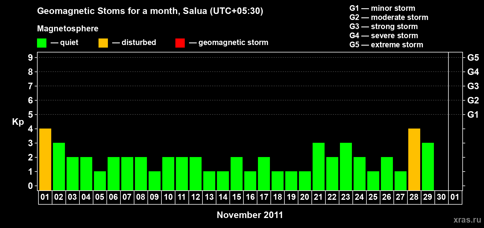 Changes in the geomagnetic index Kp from November 28 to 30, 2011 for mid latitudes