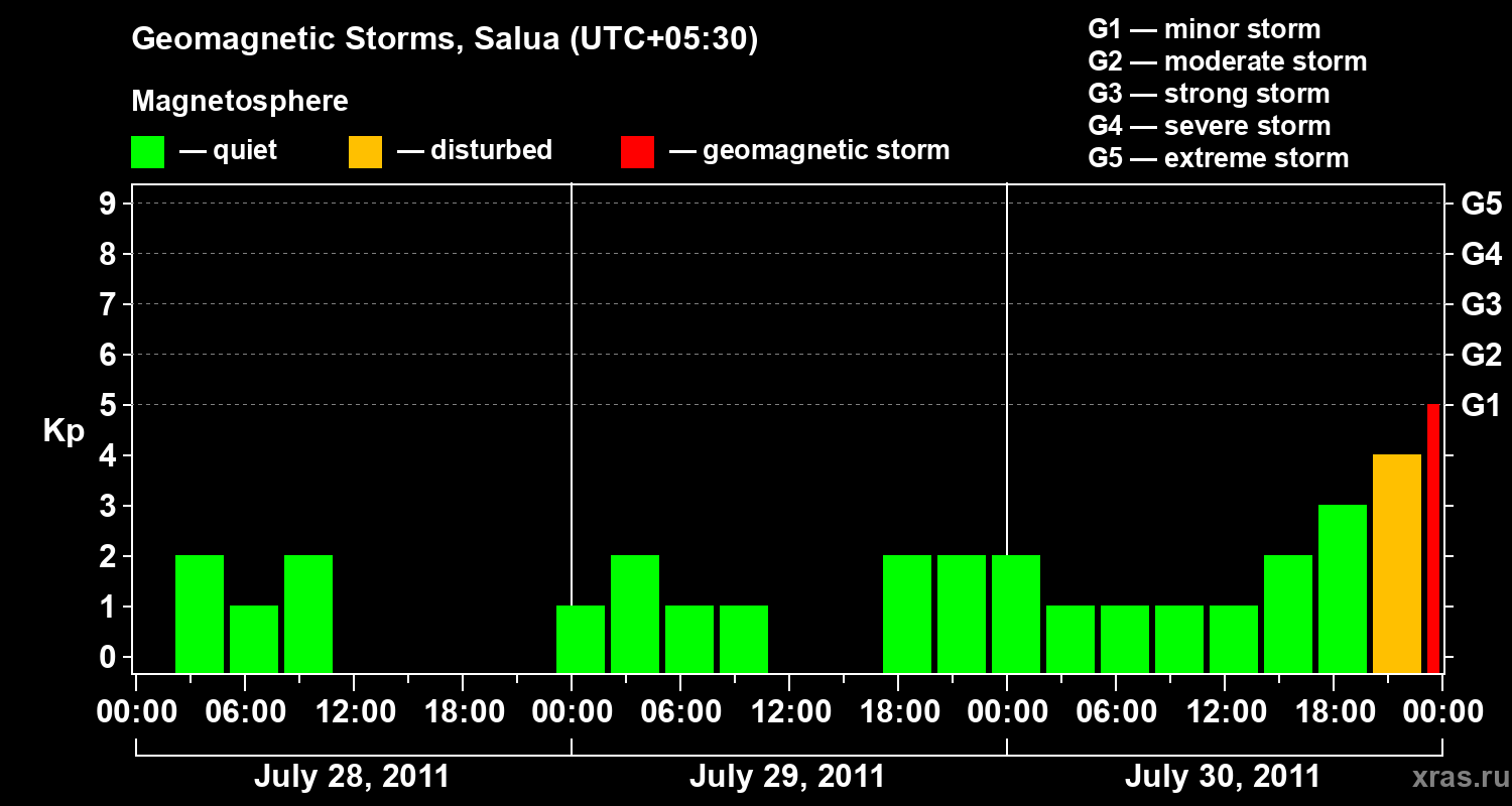 Changes in the geomagnetic index Kp from July 28 to 30, 2011 for mid latitudes