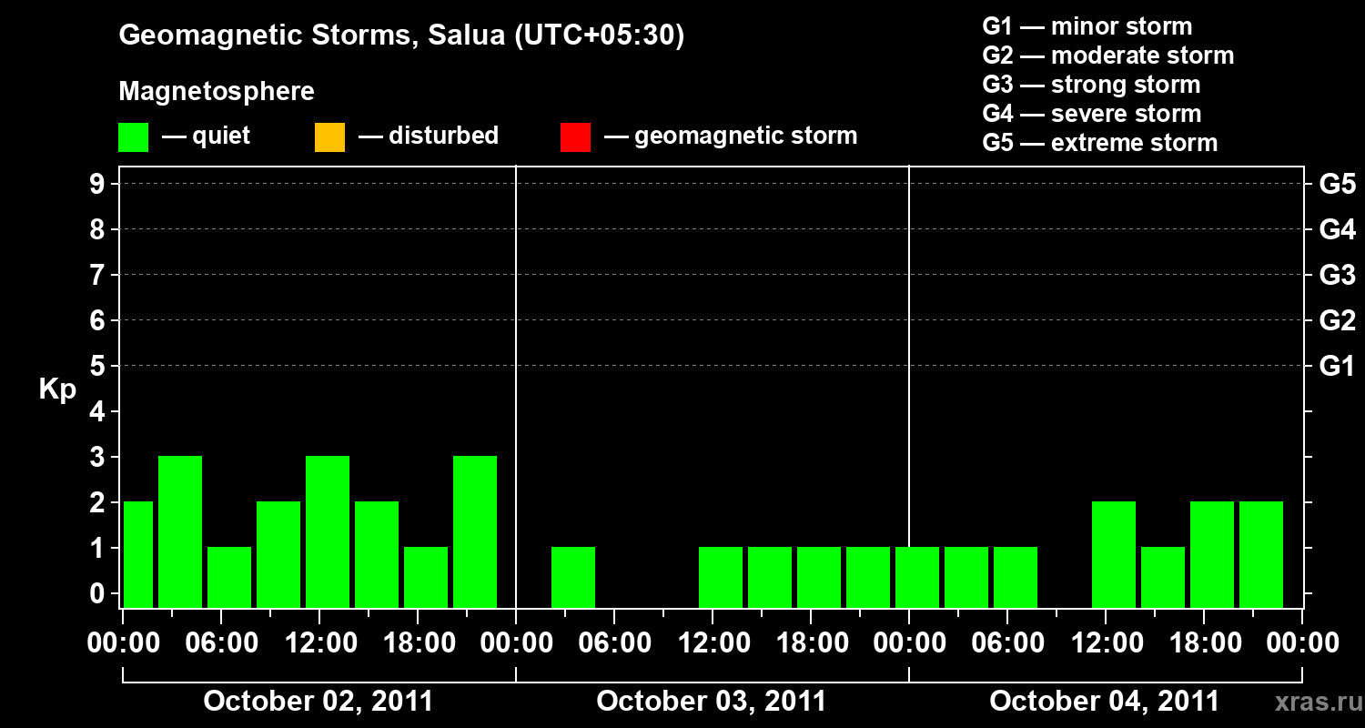 Changes in the geomagnetic index Kp from October 2 to 4, 2011 for mid latitudes