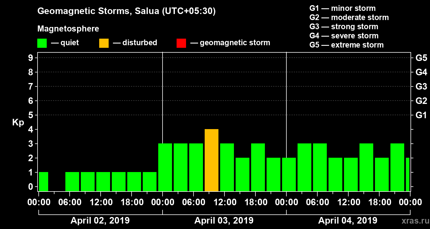 Changes in the geomagnetic index Kp from April 2 to 4, 2019 for mid latitudes