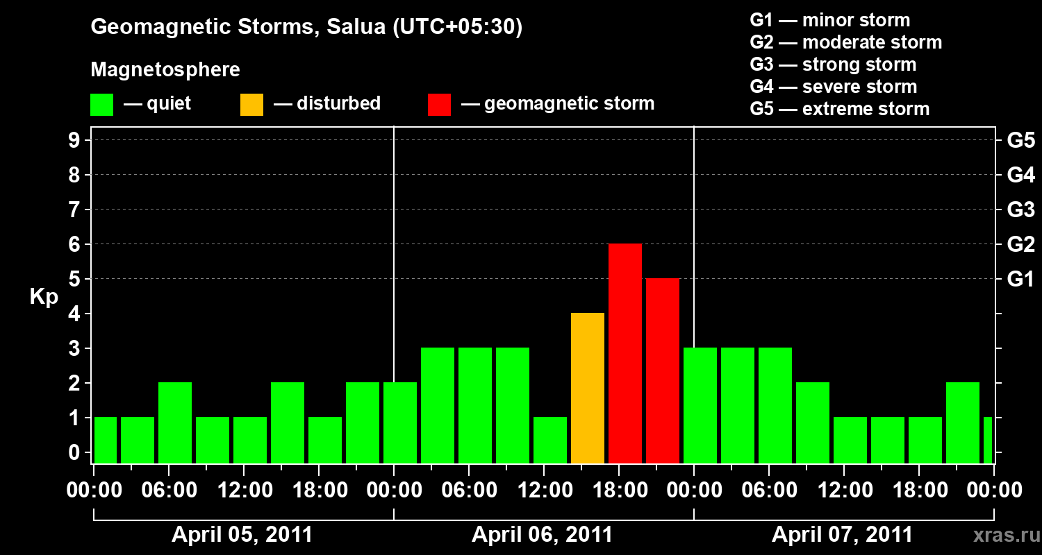 Changes in the geomagnetic index Kp from April 5 to 7, 2011 for mid latitudes