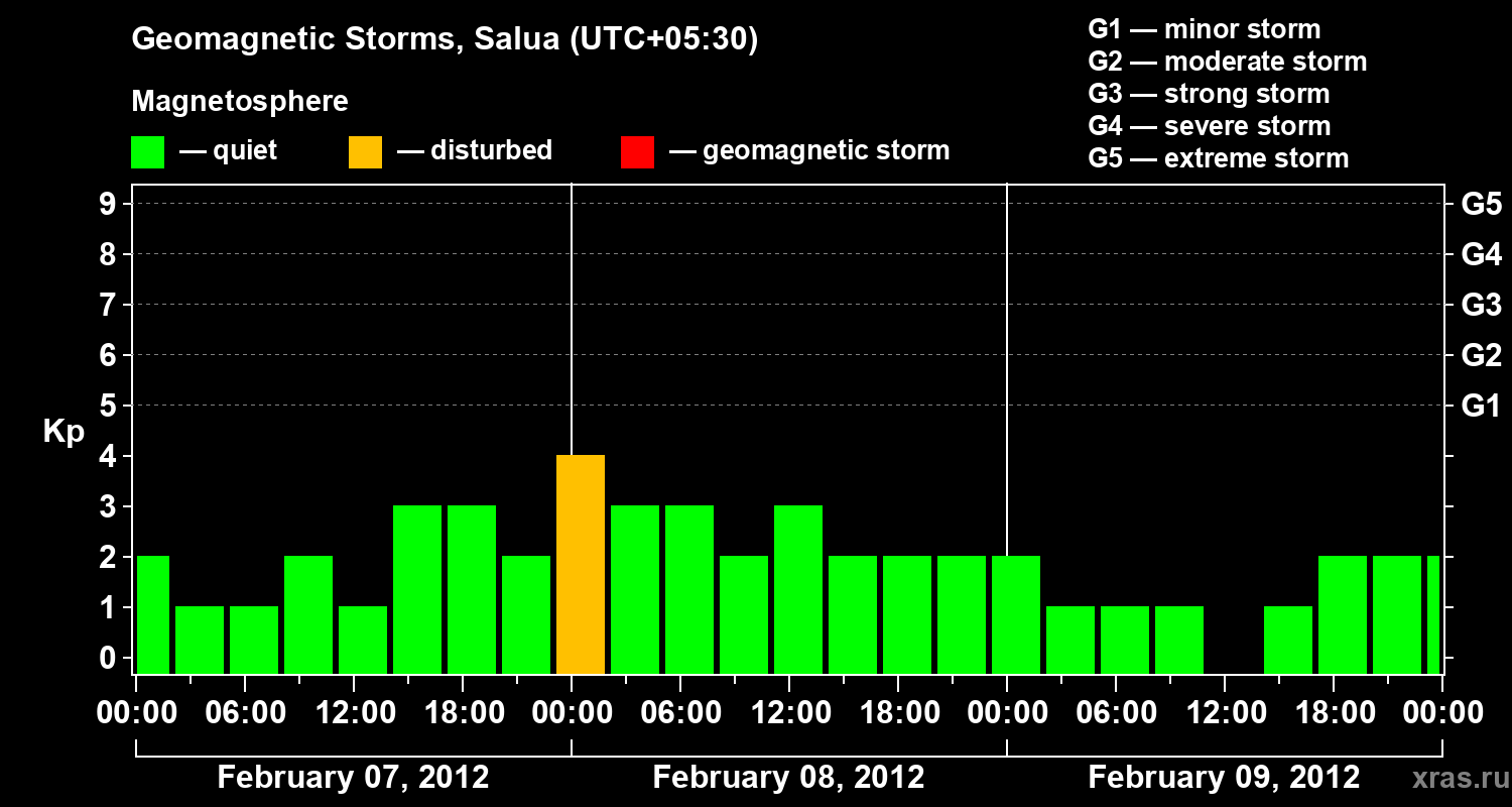 Changes in the geomagnetic index Kp from February 7 to 9, 2012 for mid latitudes