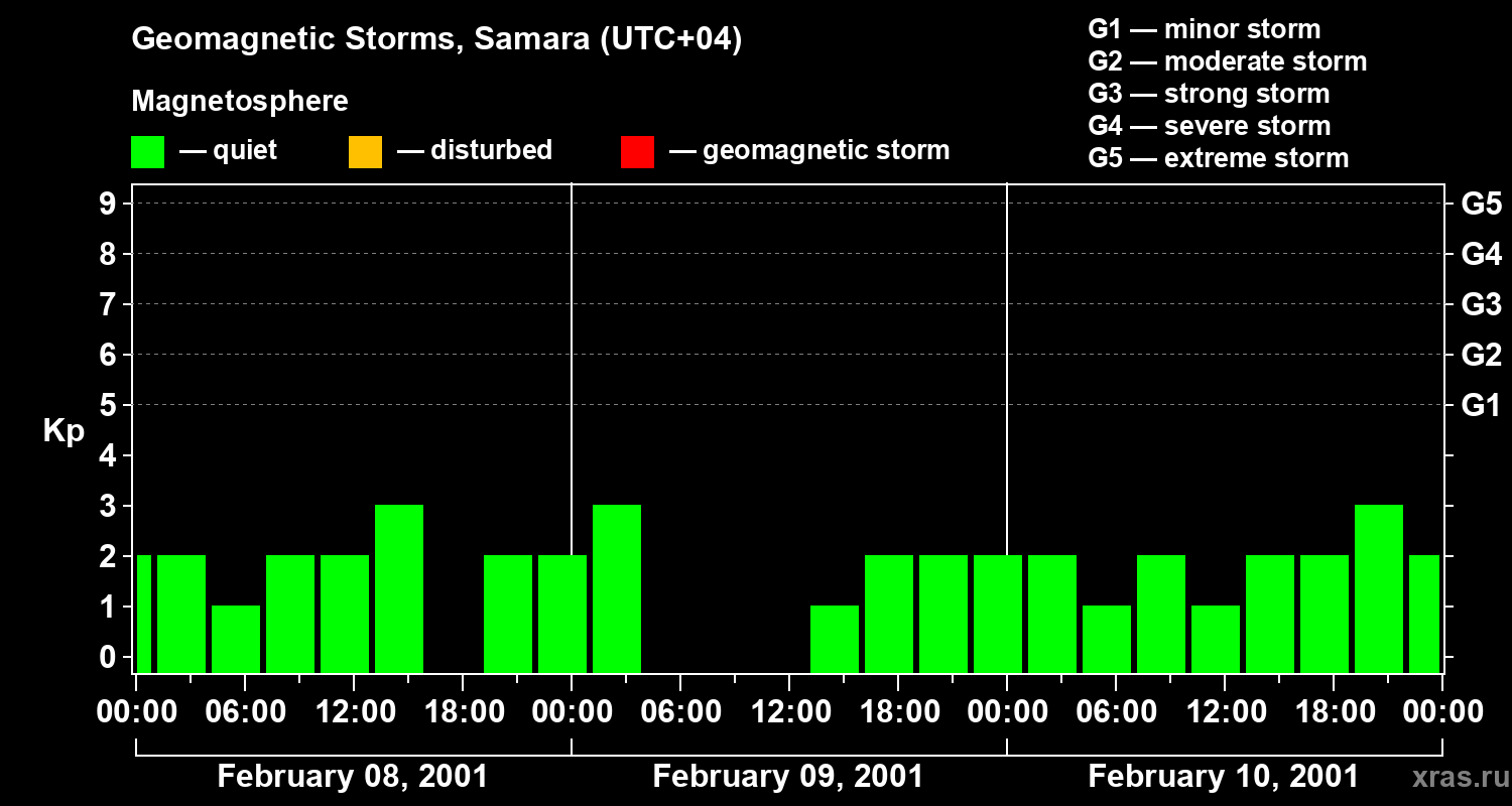 Changes in the geomagnetic index Kp from February 8 to 10, 2001 for mid latitudes