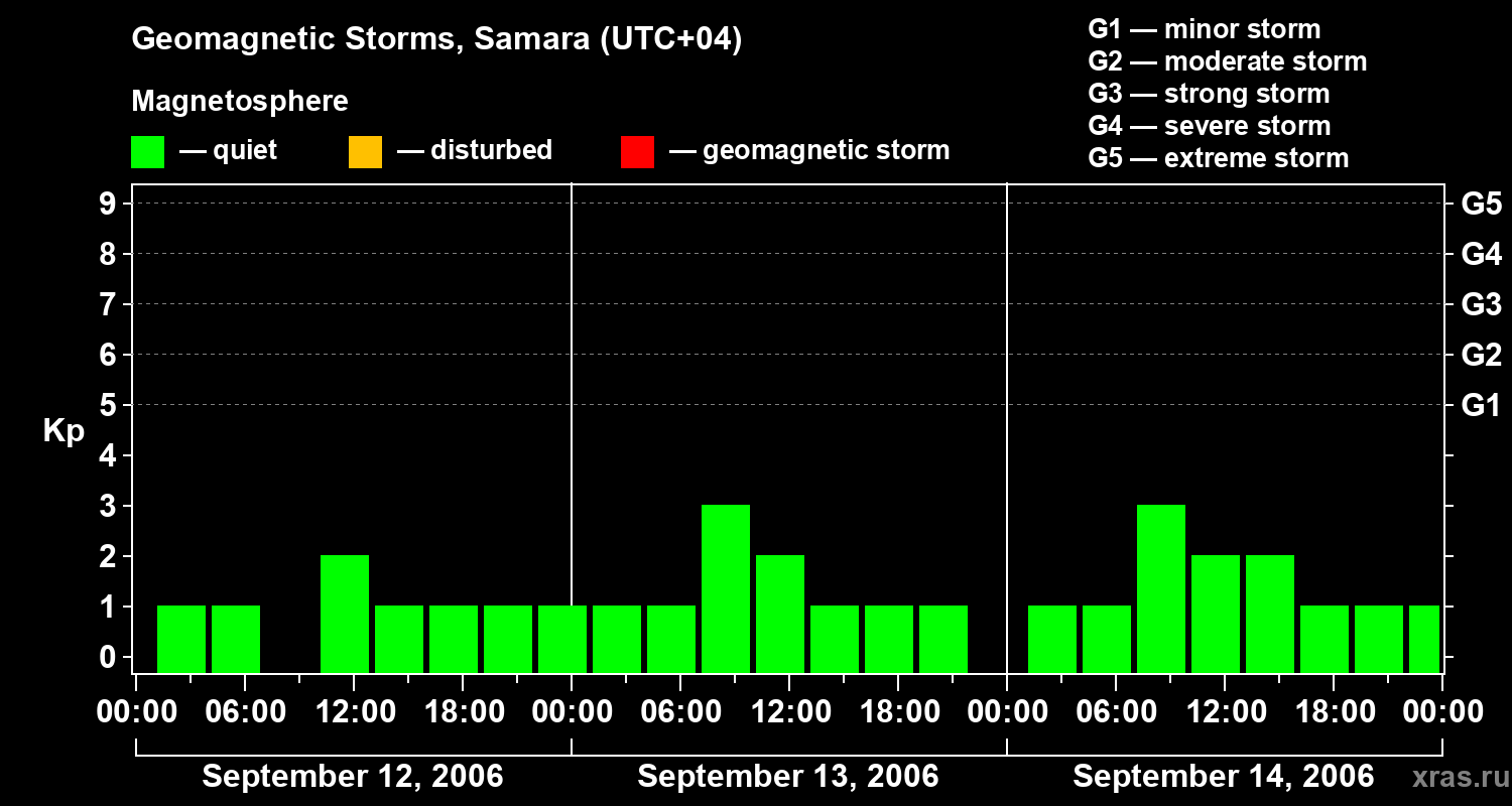Changes in the geomagnetic index Kp from September 12 to 14, 2006 for mid latitudes