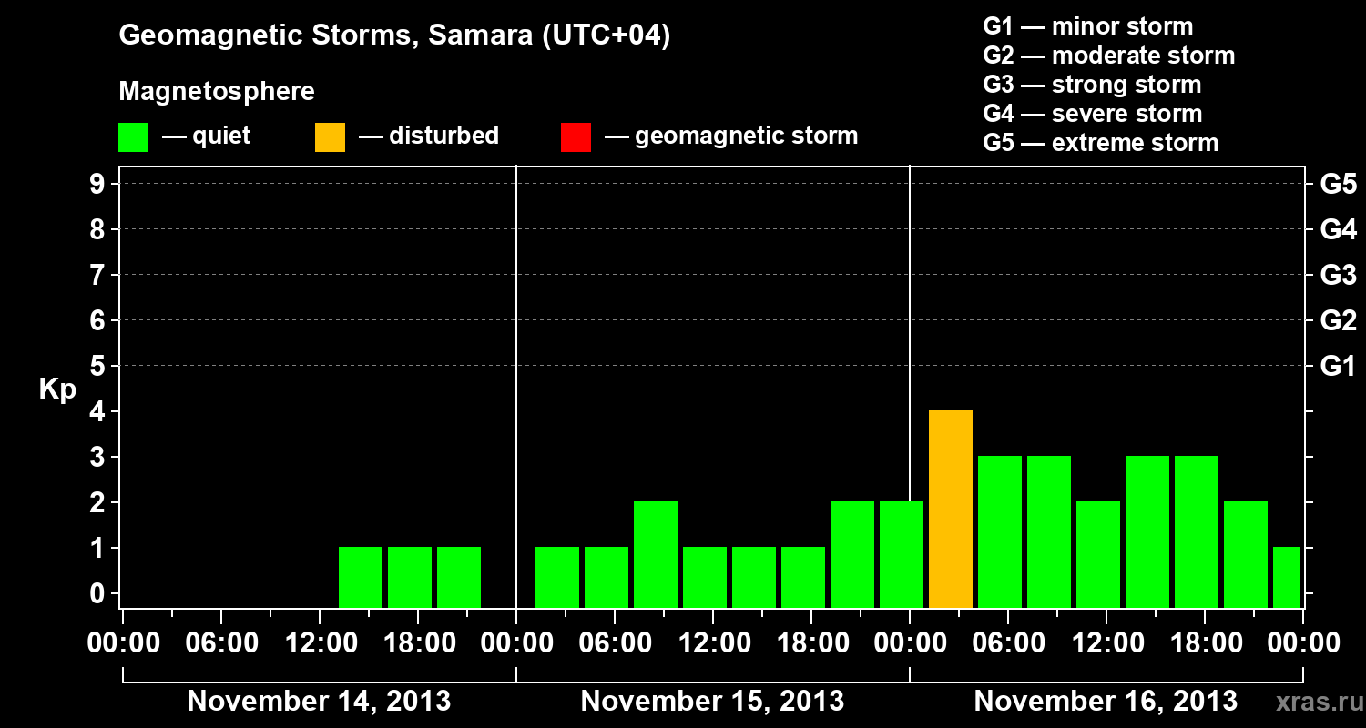 Changes in the geomagnetic index Kp from November 14 to 16, 2013 for mid latitudes
