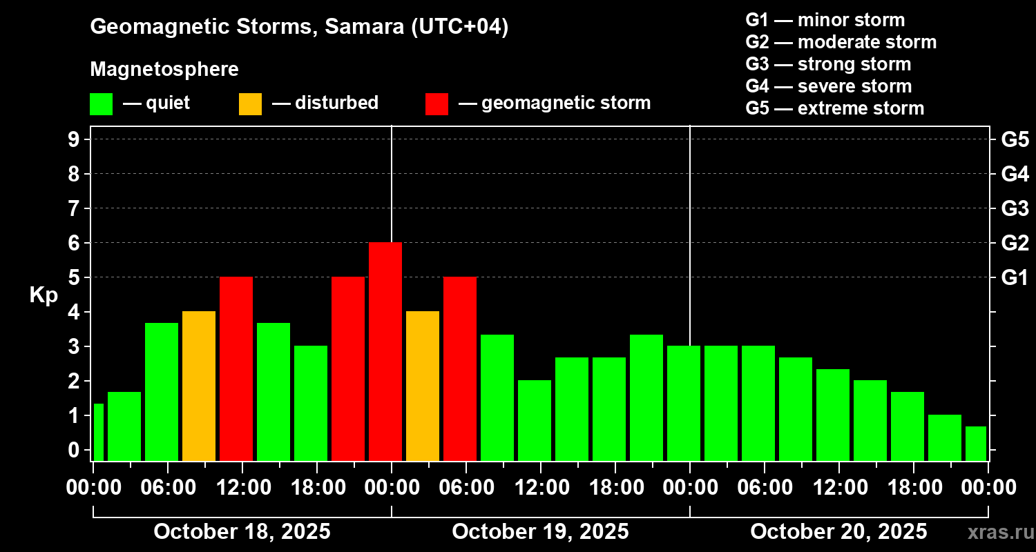 Changes in the geomagnetic index Kp from October 18 to 20, 2025 for mid latitudes