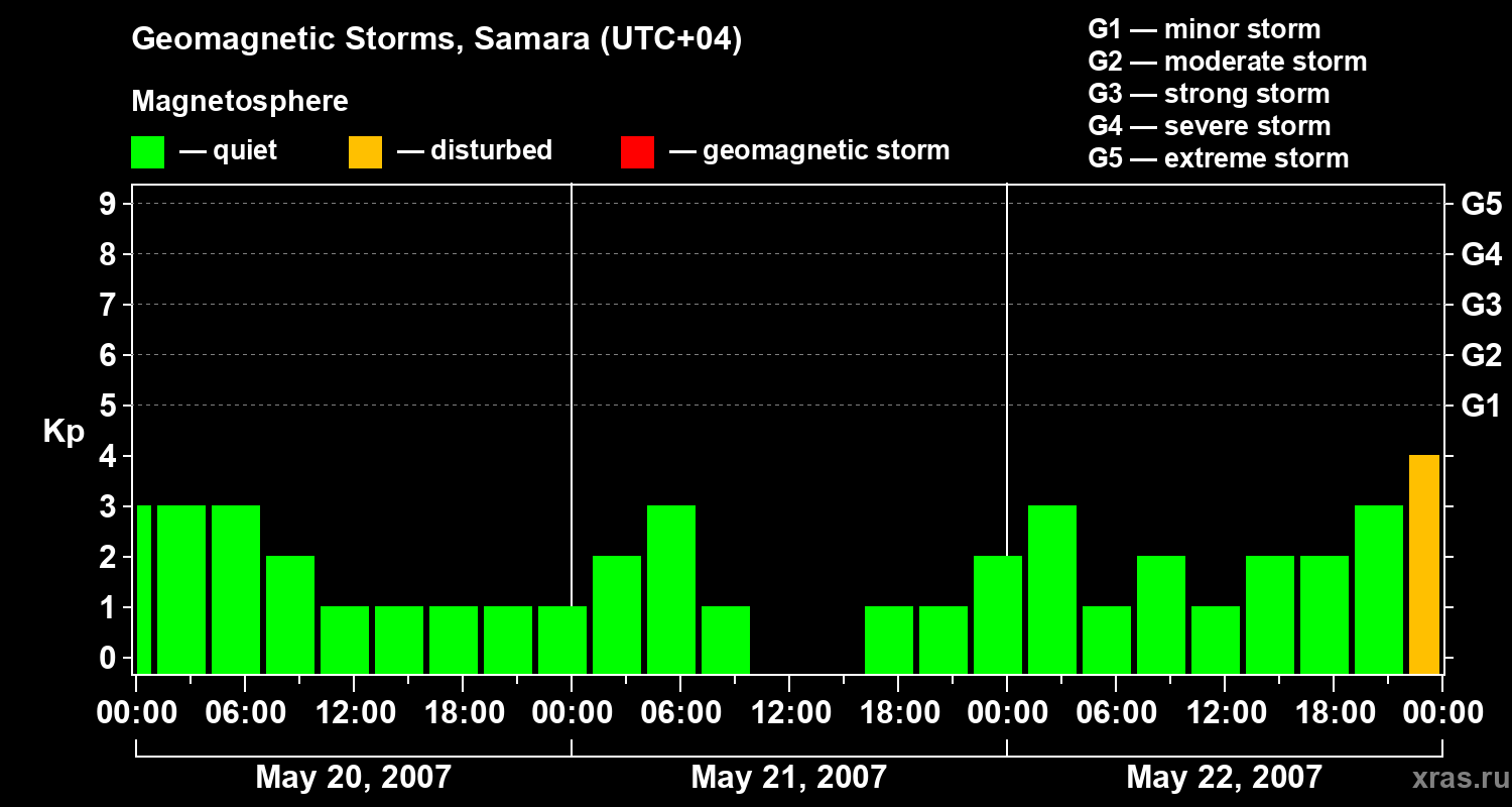 Changes in the geomagnetic index Kp from May 20 to 22, 2007 for mid latitudes