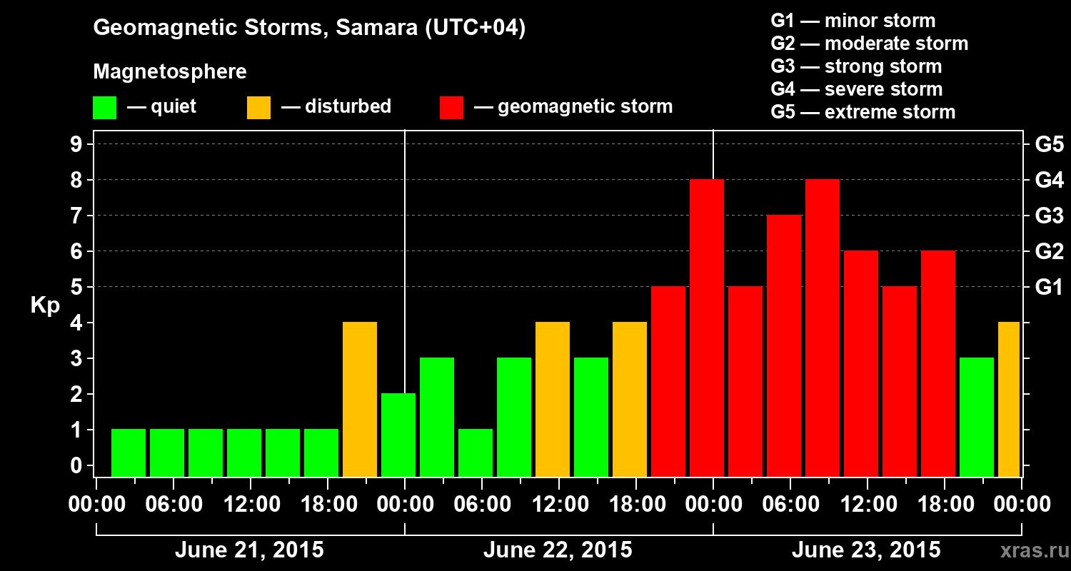 Changes in the geomagnetic index Kp from June 21 to 23, 2015 for mid latitudes