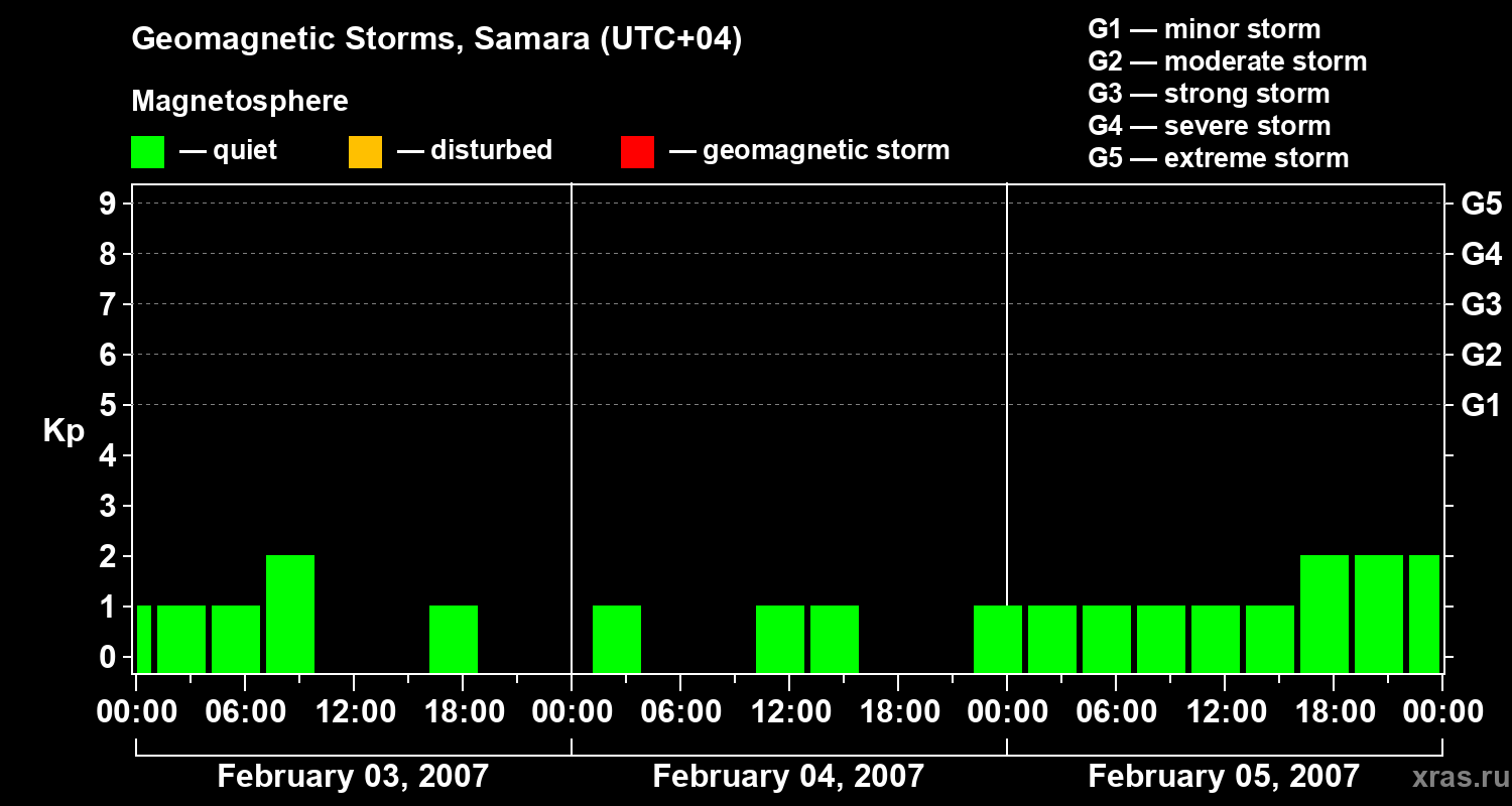 Changes in the geomagnetic index Kp from February 3 to 5, 2007 for mid latitudes