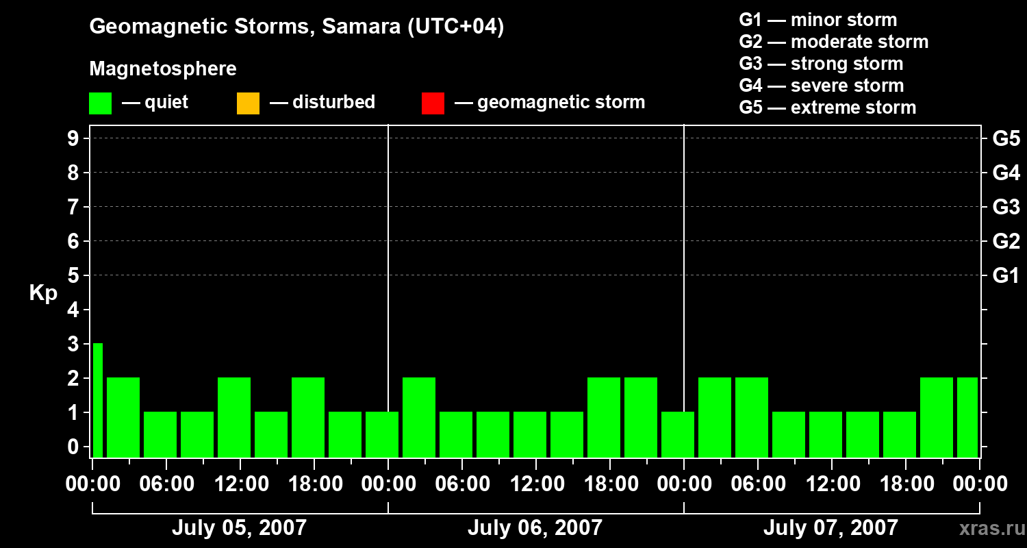 Changes in the geomagnetic index Kp from July 5 to 7, 2007 for mid latitudes