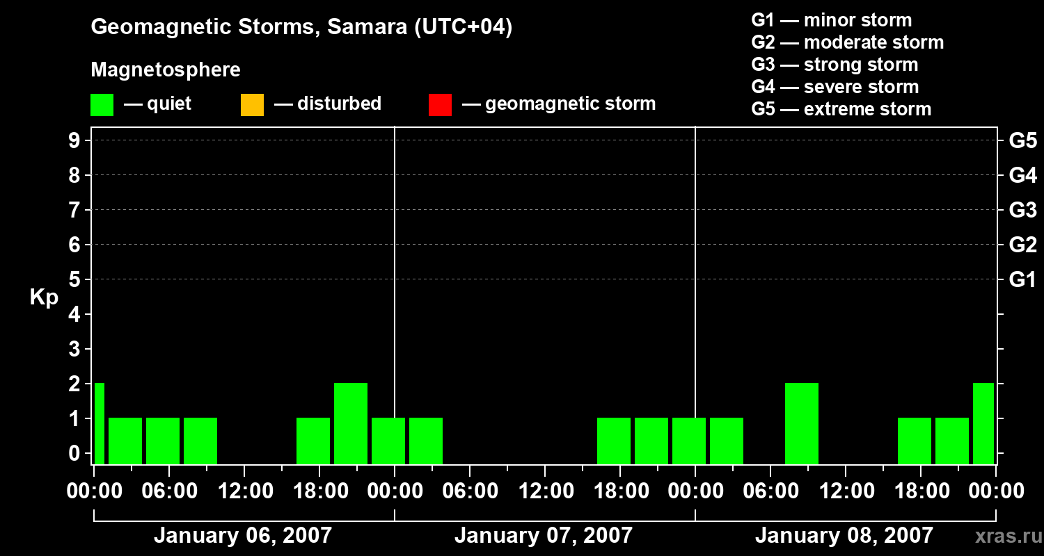 Changes in the geomagnetic index Kp from January 6 to 8, 2007 for mid latitudes