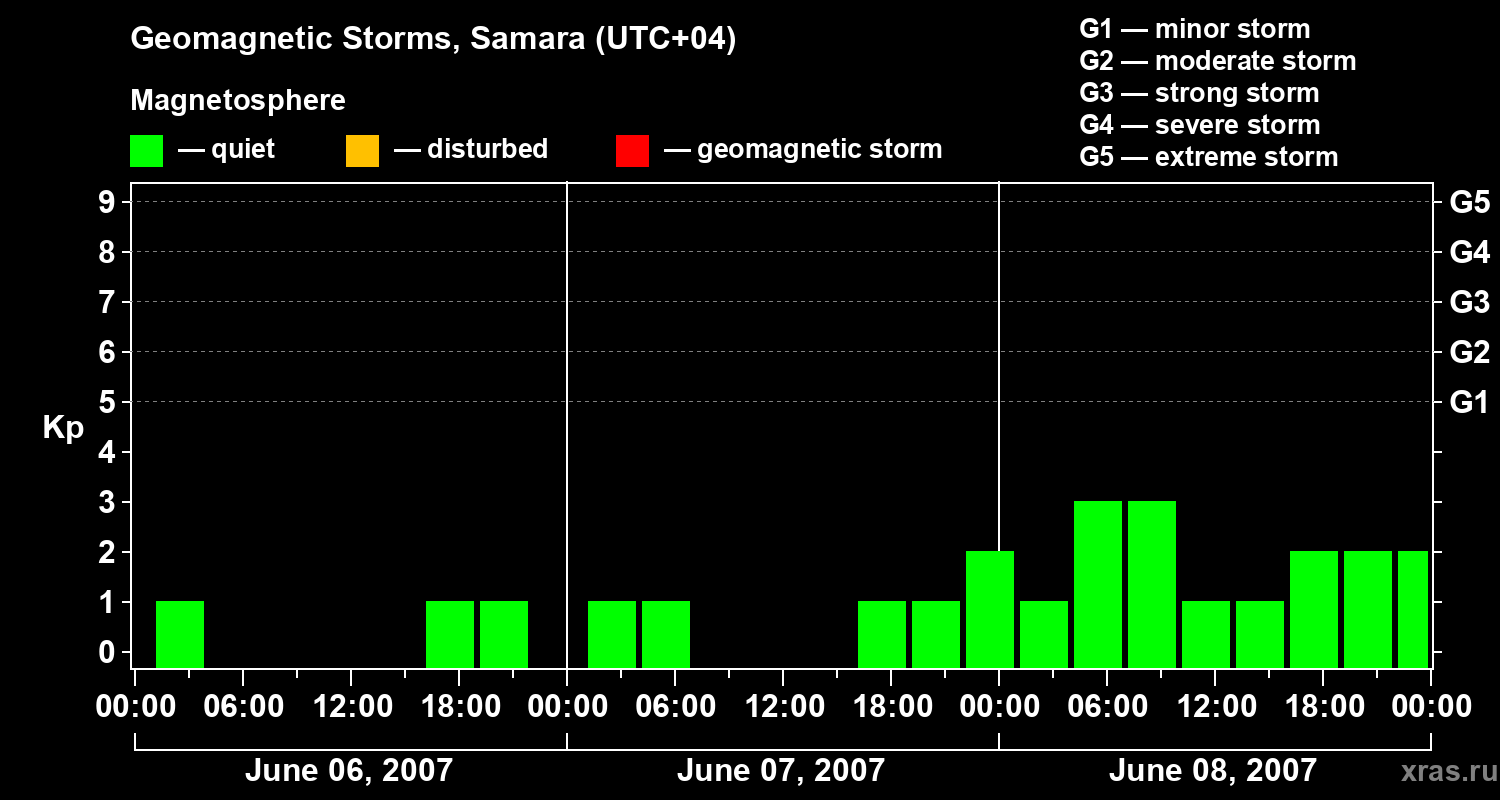 Changes in the geomagnetic index Kp from June 6 to 8, 2007 for mid latitudes