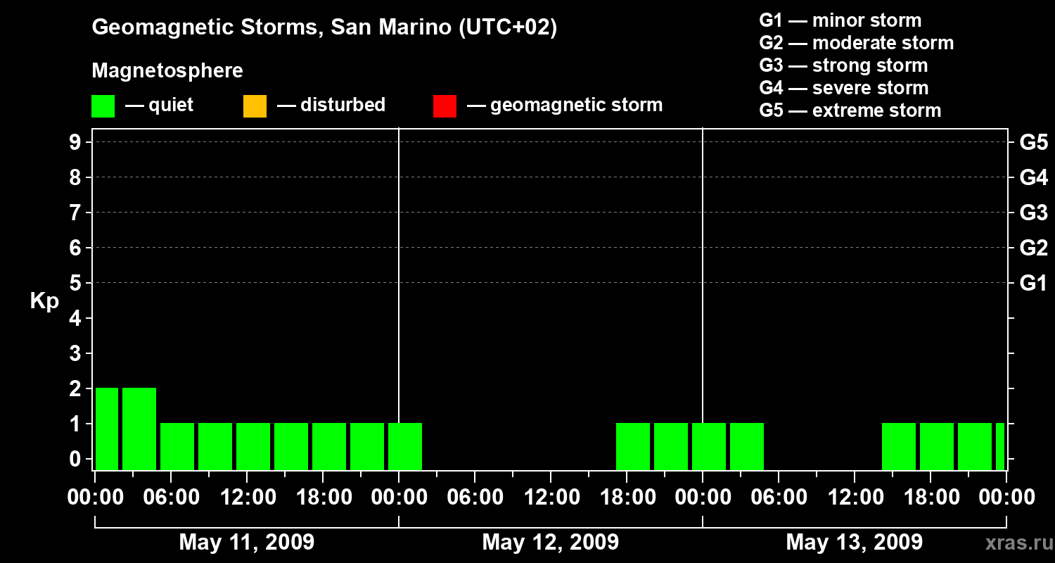 Changes in the geomagnetic index Kp from May 11 to 13, 2009 for mid latitudes