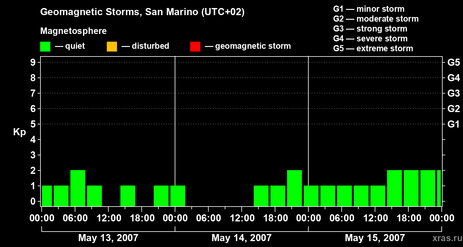 Changes in the geomagnetic index Kp from May 13 to 15, 2007 for mid latitudes