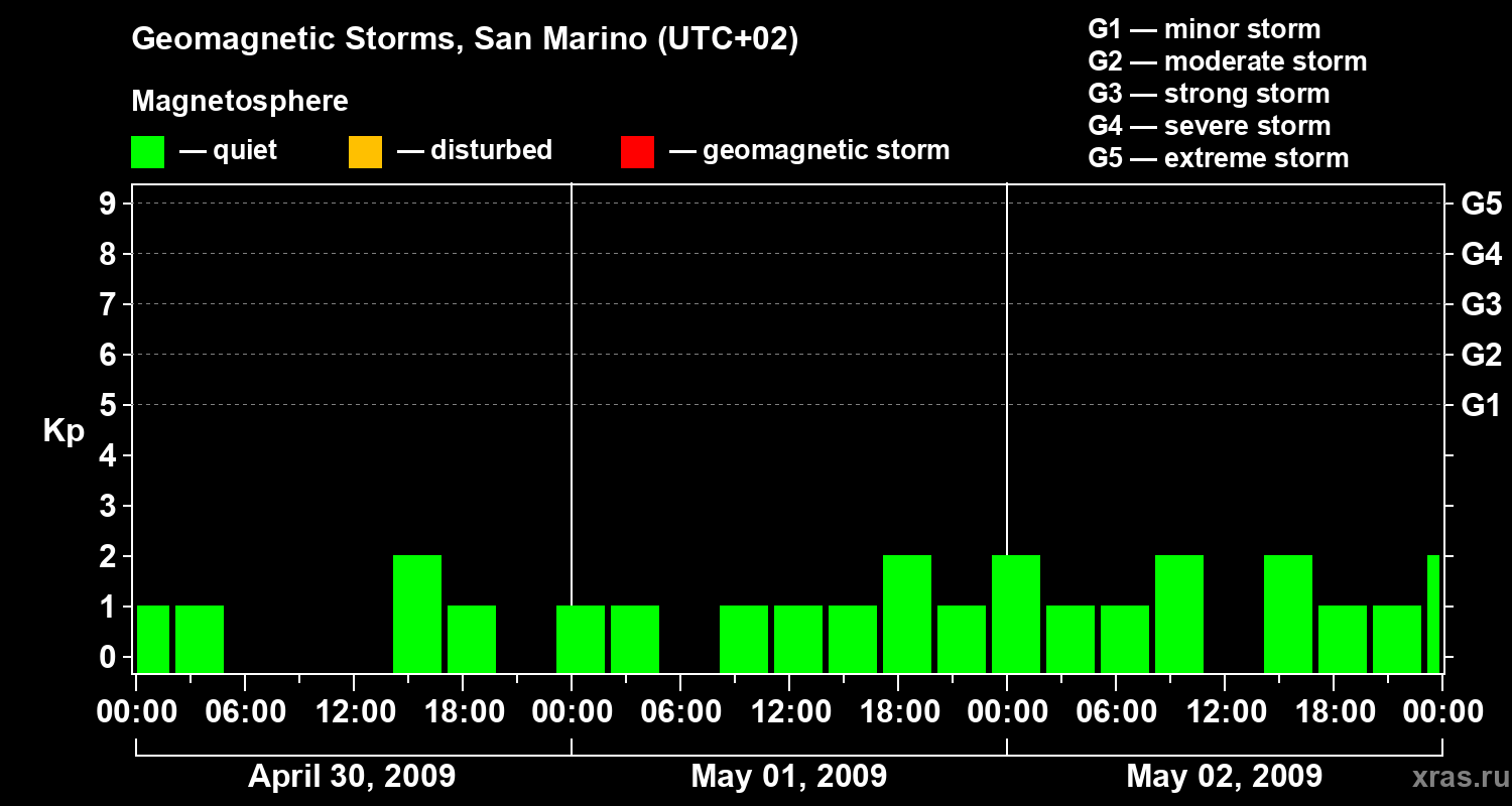 Changes in the geomagnetic index Kp from April 30 to May 2, 2009 for mid latitudes