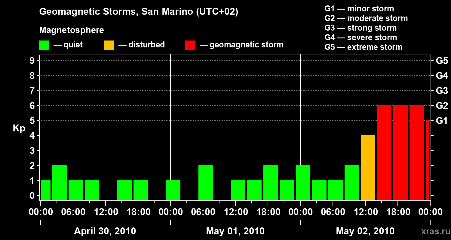 Changes in the geomagnetic index Kp from April 30 to May 2, 2010 for mid latitudes