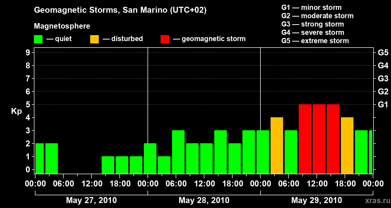 Changes in the geomagnetic index Kp from May 27 to 29, 2010 for mid latitudes